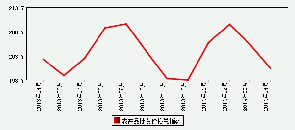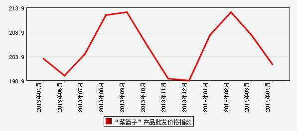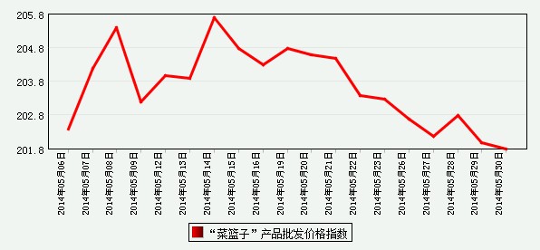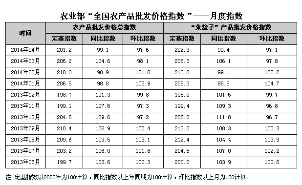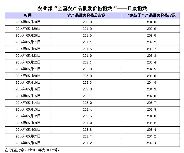 新華食品6月3日電 據農業部“全國農產品批發市場信息網”監測:2014年05月30日,農產品批發價格總指數是 200.8(以2000 年為100),“菜籃子”產品批發價格指數是 201.8(以2000年為100)。