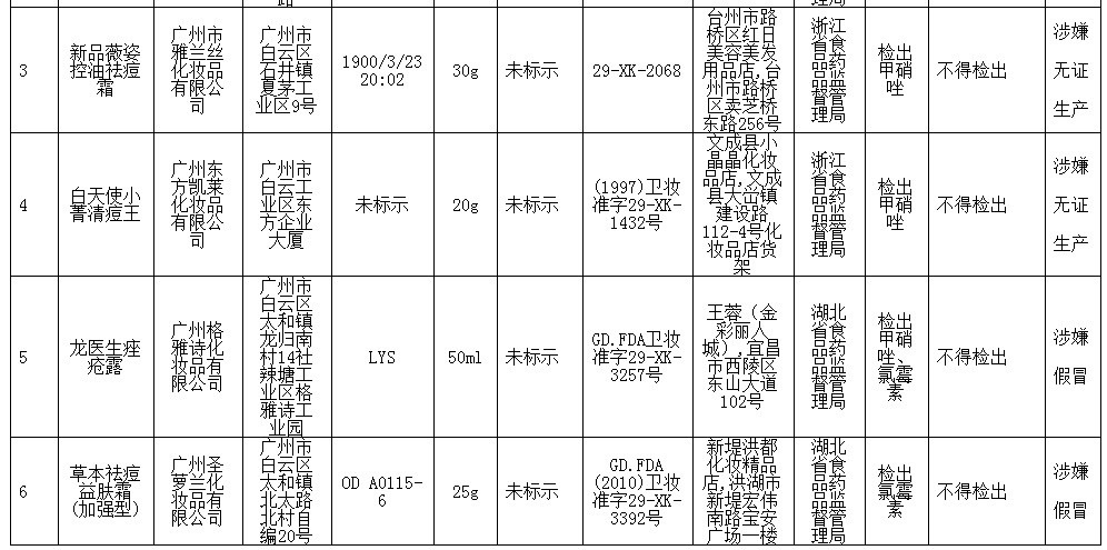 新華食品6月25日電 國家食品藥品監督管理總局(以下簡稱:食藥監總局)24日公布了對宣稱祛痘/抗粉刺和美白/祛斑類化妝品的國家監督抽檢結果,6批產品檢出禁用物質。其中,其中,契爾氏雪鹽止痘祛印膏、苗老祖祛印精華液、苗老祖祛印精華液、白天使小菁清痘王、龍醫生痤瘡露均檢出禁用物質“甲硝唑”;龍醫生痤瘡露、草本祛痘益膚霜檢出禁用物質“氯霉素”。(不合格名單詳見附件)