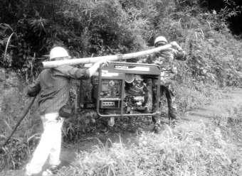 ▲ 搶修人員肩扛油機趕往C網基站受災點
