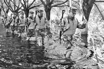 “我們的巡邏執勤沒有一天中斷。”黑河軍分區領導介紹說,不少邊防連隊被洪水圍困,一些邊防站營房外的洪水深達一兩米。可各營連巡邏執勤任務不變,能乘車的乘車,能徒步的就趟水執勤,水實在太深就乘艇巡邏。