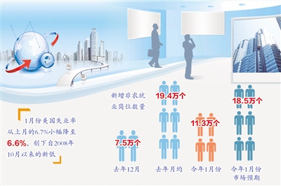 美國勞工部最新公布的就業報告顯示,1月份美國失業率從上月的6.7%小幅降至6.6%,創下自2008年10月以來的新低,但當月新增非農就業崗位數量僅為11.3萬個,遠低于市場預期的18.5萬個,也低于去年全年19.4萬個的月平均水平。去年12月新增非農就業崗位數量僅為7.5萬個,為3年來的最低月度增幅。連續兩個月新增非農就業崗位的大幅下滑表明,盡管美國經濟正在復蘇,但就業市場的康復遠未完成。