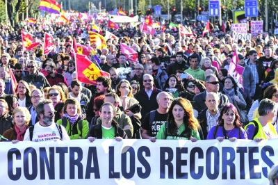 示威者22日在西班牙首都馬德里舉行大規模遊行抗議活動,反對政府採取的財政緊縮措施。為解決沉重的公共債務問題,西班牙政府過去兩年一直在推行財政緊縮和增稅措施,旨在2012年至2014年間節省1500億歐元。但這使西班牙經濟疲弱形勢加劇,失業率高達26%,引起民眾不滿。