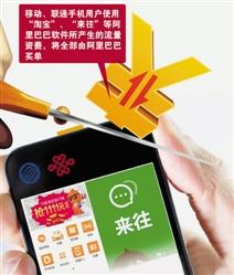 據透露,阿里已經和移動、聯通完成洽談,移動、聯通手機用戶使用淘寶、來往、天貓等阿里軟件所產生的流量資費,將全部由阿里買單。