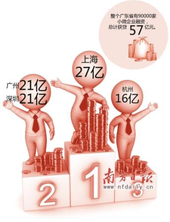 從阿里提供的數據可以看到,3季度,上海、深圳、廣州、杭州佔據融資總額的前4位,季度累計融資分別達到27億元、21億元、21億元和16億元。而整個廣東省則有90000家小微企業,總計獲貸57億元。