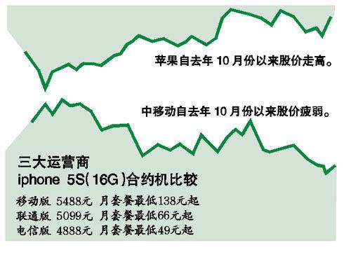 不少用戶感嘆移動版iphone誘惑力不錯,但價格偏貴。 而為應對中國移動4G版iPhone衝擊,中國聯通和中國電信近期均下調了iPhone 5S/5C的合約機價格,但全國各地售價並不一致。以廣東為例,聯通iPhone 5S(16G)的合約價已降為5099元,而電信版iPhone 5S(16G)的合約價已降為4888元。