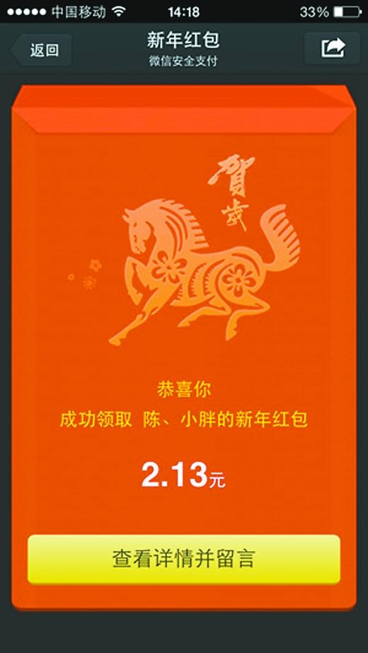 在年前,網絡上掀起了一股“發紅包”、“搶紅包”的熱潮。支付寶和微信甚至打起了“紅包大戰”,並延伸至網絡互動平臺“來往”、新浪微博等社交網站上。數據顯示,除夕到大年初一16時,有超過500萬人參與了微信搶紅包,總計搶紅包7500萬次以上。