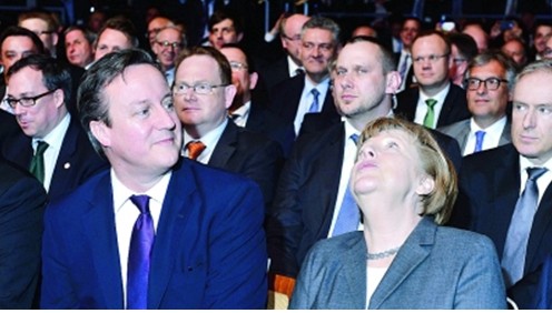 3月9日,在德國漢諾威,德國總理默克爾(前右)和英國首相卡梅倫(前左)出席漢諾威IT展開幕式。