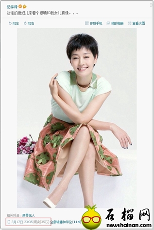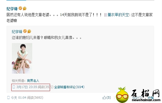 消息稱,微博認證博主、遊戲公司巨人網絡總裁紀學鋒在兩周前(3月17日晚間23:35)發出一條耐人尋味的微博,微博配圖是一張馬伊琍坐著的寫真照,配文“這誰的媳婦兒來著?眼睛和我女兒真像。。。”這條微博當時未引發眾人關注,但在今天淩晨文章、馬伊俐兩人微博發聲確認文章“出軌門”之後,該條微博被人肉出來並瘋轉。