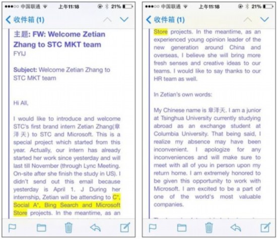 3月21日,在北大的未名站的一則招聘啟事中,已經將奶茶MM章澤天即將出現在微軟實習做了劇透,當時稱是STC-SearchAdsTeam,去市場部實習。也有消息說奶茶妹妹是走公關的路線。本次的郵件證實了這一傳聞,但並非是去的SearchAdsTeam,而是STC MKT team。