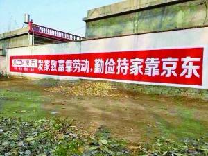 “6·18”大促當天,京東商城的官方微博發出一條微博:“既能出國,也要下鄉;高大上起來進得了紐約時代廣場,接地氣下去能涂遍農村的紅磚牆。”配圖中除了一張紐約時代廣場的巨幅廣告,更引人注目的是紅底白字刷在農民家牆上的宣傳語:“發家致富靠勞動,勤儉持家靠京東”。