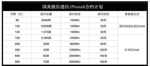 四、國美極信通信:iPhone6合約套餐80元至990元