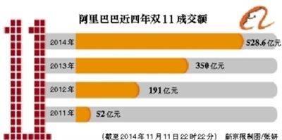 新京報訊 (記者劉夏)昨天,阿里巴巴、京東上市後的首個“雙11”來臨,國內電商雙寡頭格局初現。截至昨晚10時22分,天貓成交額已達到528.6億元,京東在中午成交額已與去年全天持平,均收獲了不錯戰果。阿里巴巴股價已較上市累計上漲超75%,市值刷新。