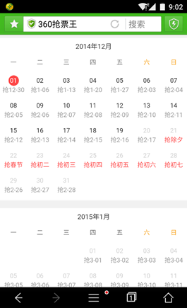 除了自動刷票為用戶搶票時間爭分奪秒外,由于火車票預售期延長60天,如此長的預售周期讓計算春運搶票時間也需花費一定時間。通過360手機衛士搶票版中的搶票日歷,可迅速查看“搶除夕”、“搶春節”的搶票日期,大大節省計算搶票時間煩惱。此外,360手機衛士搶票專版還將在近期上線離線搶票,屆時用戶只需通過360手機衛士搶票入口登記購票信息,無需打開搶票入口就可以通過後臺自動刷票,係統會通過短信通知搶票是否成功。