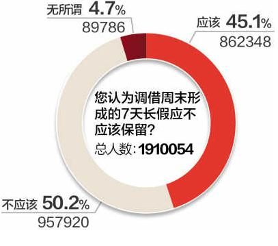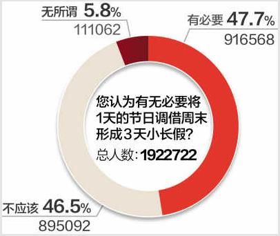 記者分析網上調查結果發現,大多數網友對現行法定節假日放假安排表示不滿,而對于是否調借周末形成7天長假、3天小長假的問題,意見分歧嚴重。特別是針對3天小長假“挪2做3”,反對聲尤為強烈。
