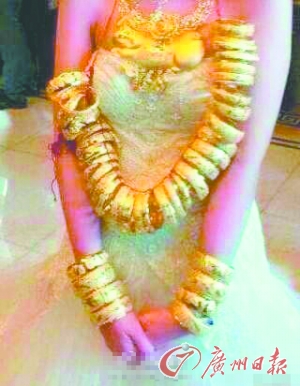 @揚子晚報:近日,小欖一位新娘出嫁時組照曝光,該新娘僅金手鐲就戴了19對,胸前還佩戴一只大金豬。網友:“這是租的還是?”“我就是小欖妹,這很正常。”“土豪層出不窮”……