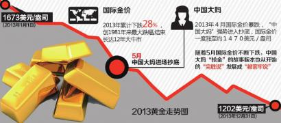 2013年,黃金12年的牛市終結,熊市開啟。全年金價大跌近30%,創下32年來最大年度跌幅,在“搶金潮”中走紅的“中國大媽”也因此被深度套牢。有人說,2013,黃金最“坑媽”。那麼,2014,金價幾何?“中國大媽”能否解套?