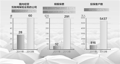 該報告提供的2011—2013年三年的行業經營數據顯示,2011年至2013年,國內經營互聯網保險業務的公司從28家上升到60家,年均增長達46%;規模保費從32億元增長到291億元,三年間增幅總體達到810%,年均增長率達202%;投保客戶數從816萬人增長到5437萬人,增幅達566%。