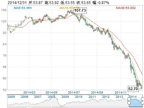 作為2014年金融市場最“熊”品種之一,國際油價自6月站上年內高點後便開啟了斷崖式下跌模式。12月以來,紐約油價和布倫特油價雙雙跌破每桶60美元大關,刷新五年半新低。紐約期貨原油更是一度下探至每桶53美元左右,較年內高點107美元近腰斬;倫敦布倫特原油期貨同樣疲軟,最低于每桶57美元左右徘徊,而年內高點達到每桶115美元左右。