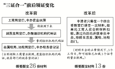 一窗受理、一表填報、一套材料、一張執照……江蘇省工商局副局長楊衛東用一組數字證明“三證合一”的改革效果:原來提交26份材料,現在僅需交13份,減少一半;申請者此前得填寫166個數據項,現在僅需填74個,壓縮一半以上;原來部門各自審查事項,現在工商已審查過的,其他部門不再重復審查。