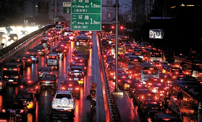 2012年9月25日,傍晚時分北京持續降雨,大望路東向西主輔路擁堵嚴重。雙節前晚高峰交通擁堵狀況更加嚴峻。新京報記者 侯少卿 攝