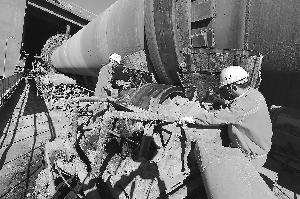 昨天,在北京金隅順發水泥有限公司廠區,兩名負責維護保養的工人師傅對已經停止運轉了的廠區生產設備進行檢查。