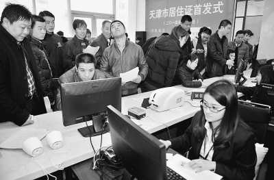本報天津1月1日電 (記者陳傑)1日,天津市正式啟動外來人口居住證申領和發放工作,首批30名來津人員領到了居住證,實行多年的暫住證將不再辦理。根據規定,在天津市已居住半年以上且擬繼續居住的境內來津人員,都應當申領居住證;凡符合條件的居住證持有人,通過積分方式可以申辦天津市常住戶口。截至2013年11月底,天津市共登記境內來津人員430余萬,其中在天津市居住半年以上、符合居住證申領條件者約240萬。圖為1月1日,來津人員在天津市濱海新區人口服務管理中心排隊辦理居住證申領手續。