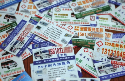 ▲很多醫院周邊黑救護車猖獗,他們公開向病人或家屬發放黑救護名片。京華時報記者陶冉攝