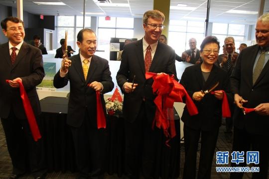 由北京中關村發展集團和渥太華市投資署共同成立的渥太華國際乳化中心4月15日在加拿大首都渥太華正式成立。圖為北京市人民政府高級顧問呂錫文(右二)、渥太華市市長吉姆·沃森(右三)和中國駐加拿大大使章均賽(左二)正式成立剪彩。記者 李保東 攝