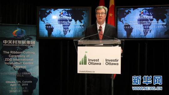 由北京中關村發展集團和渥太華市投資署共同成立的渥太華國際乳化中心4月15日在加拿大首都渥太華正式成立。圖為渥太華市市長吉姆·沃森在成立儀式上演講。 記者 李保東 攝
