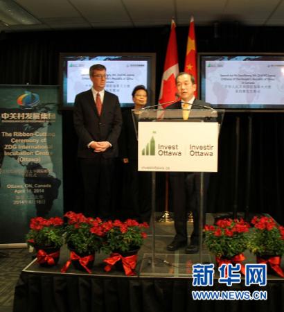 由北京中關村發展集團和渥太華市投資署共同成立的渥太華國際乳化中心4月15日在加拿大首都渥太華正式成立。中國駐加拿大大使章均賽在成立儀式演講。記者 李保東 攝