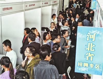 北京青年報記者能夠感覺到,三地的招聘,北京企業仍佔據著“天時、地利、人和”,相應區域也顯得人滿為患。而在天津及河北區,人氣則有些不如北京區,鮮有排隊現象。