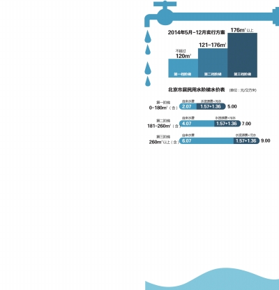 從明天起,北京市居民用水實施階梯水價,居民家庭全年用水量劃分為三檔,其中90%居民家庭在第一檔,如年用水量不超過180噸,水價由目前的4元/噸調至5元/噸。第二檔年用水量181至260噸,水價7元/噸;第三檔在260噸以上,水價達到9元/噸。此調價方案為之前在水價調整聽證會上獲多數認可的方案二,其第一檔年用水量比方案一多了35噸,對應價格每噸少了5分錢。