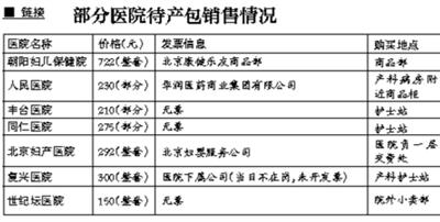 記者探訪北京10家有產科的醫院,並購買了多家醫院的部分待產包,發現各家醫院待產包內所含用品不同,價格從150元至700元不等,有的醫院,順產和剖腹產使用的待產包,價格也不一樣。