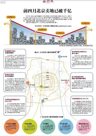 2014年,北京土地市場繼續了去年的熱度,在四月份就已突破千億關卡。前四個月,北京土地出讓金已達1055億元,是歷年來破千億速度最快的。2013年年中,北京土地出讓金收入實現1000億元,而2010年、2011年,北京都是在年底才跨越千億門檻的。但最近樓市觀望、退地傳聞等或將傳導至土地市場。