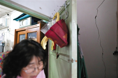 5月8日,被稱為“白紙坊第一危樓”的西城區永樂里1號樓,一戶居民家中,牆上多條裂縫中的一條,幾乎分割了整面牆。此樓建于1966年,建築壽命僅約20年。2009年被鑒定為C級危樓,要求居民騰退,但因安置問題,騰退搬遷一直拖延至今。而全北京類似危房有800余棟,亟待騰退拆除。