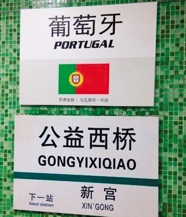 昨天,4號線公益西橋站,原有地鐵站名銘牌的上方,已挂出另一個銘牌,上面寫著葡萄牙。