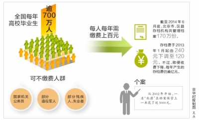 根據北京市人力資源和社會保障局提供的數據,截至2014年6月底,北京市、區縣存檔機構共管理檔案170萬份,存檔費于2013年1月起由240元下調至120元。不過,即便收費下降,每年產生的存檔費仍逾億元。