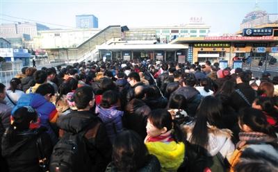 昨日,北京站地鐵站入口處乘客在排隊進站。返京高峰,雖然排隊乘客較多,但並未出現大規模的擁堵。 新京報記者 彭子洋 攝