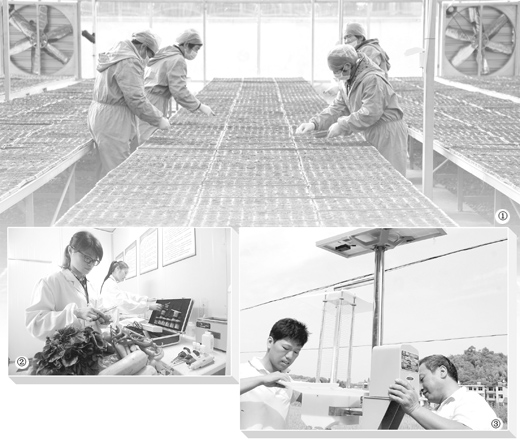 圖①:河南紅英農業科技園推廣無土栽培、環保低碳的綠色果蔬種植,形成年產3000噸杏鮑菇的生產規模,產品暢銷港澳地區。