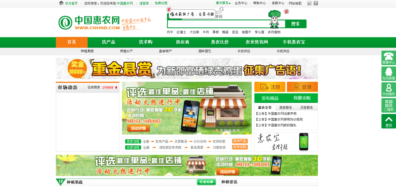 通過中國惠農網,賣家可以利用惠農店鋪,精致的呈現自己的產品和服務,同時,買家也可以很方便的找到自己所需求的產品、價格、生產商等。生產廠家還可以與農業專家進行遠程“面對面”交流,解決實際遇到的生產技術問題。在信息化爆棚的時代,中國惠農網對龐大的數據進行過濾盒深度提煉,第一時間發布最新行業信息、解讀“三農”政策、更新農產品行情,讓您最大化尊享信息所帶來的便捷和機遇。中國惠農網推出六大保障(“敢賠模式”、“托管模式”、強力推廣“大流量、高轉化率”、安全溯源“惠農碼”、農業解惑“專家幫忙”、商機不離手“手機惠農寶”)不僅提供了海量農業商機,還為您的安全交易提供了可靠環境。