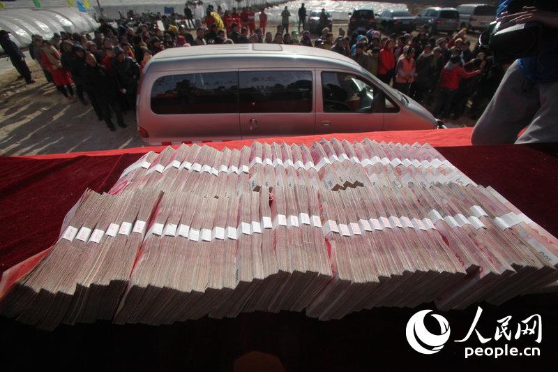 2014年01月20日,濟南長清區萬德鎮靈岩有機茶園,近百萬大鈔現金“堆積如山”,村民正排長龍領取現金,臉上流露出笑容。