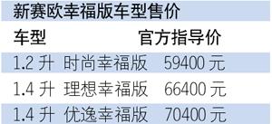 10月9日,上海通用雪佛蘭新賽歐新推三款三廂幸福版車型——1.2升時尚幸福版、1.4 升理想幸福版和1.4升優逸幸福版,售價分別為5.94萬元、6.64萬元和7.04萬元,並于即日起在全國各大雪佛蘭經銷商展廳接受預訂和銷售。
