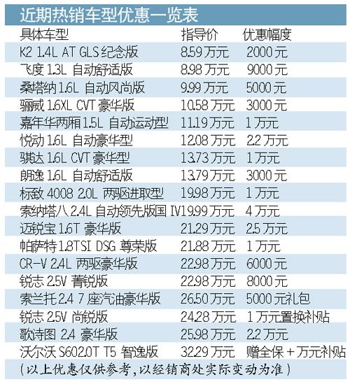 如別克車型,老君威雖庫存不多但有3萬元的現金優惠、買新君威送5000元禮包,老君越優惠3.2萬元,英朗優惠1.5萬元左右,昂科拉優惠1萬元左右,需要等20天左右可提車。老款GL8優惠2萬元,新款優惠5000~8000元;豐田車型方面,皇冠最高優惠4萬元,花冠和卡羅拉則有7.7折,新RAV4無優惠,置換有1000元的補貼,預訂新威馳有禮包送;北京現代索納塔八優惠不錯,最高達2.8萬元;福特新福克斯優惠8000元,翼博、翼虎均無優惠,訂車等2個月,嘉年華優惠1萬元;廣本歌詩圖最高優惠10萬元,飛度優惠近1萬元,鋒范優惠2萬元。