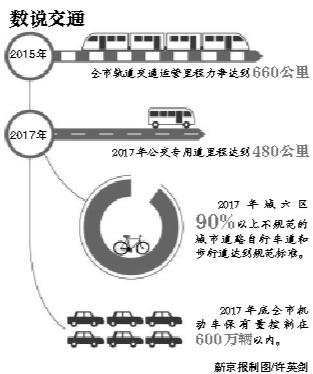 《方案》提出,主要目標是大力發展公共交通,2017年中心城區公共交通出行比例力爭達到52%。目前,北京中心城區的公共交通出行比例為44%。嚴格機動車總量調控,根據北京公布的清潔空氣計劃,到2017年全市機動車保有量控制在600萬輛。對比目前機動車保有量,未來幾年實際上還會增長80萬輛。