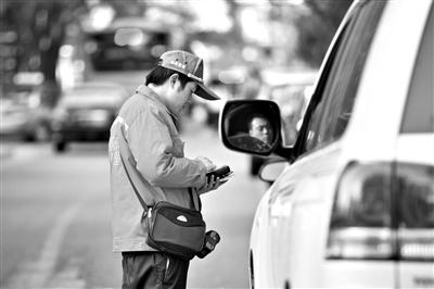 10月15日,朝陽區東大橋路,停車管理員從腰間掏出一個專用POS機,正在錄入停車信息。記者 周崗峰 攝