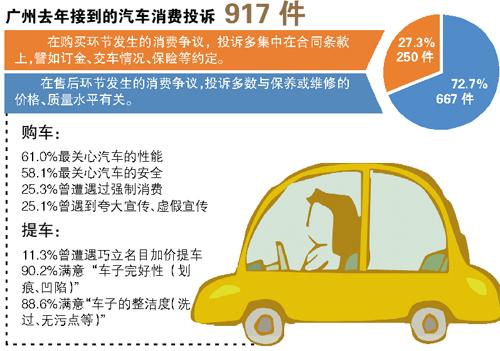 156萬元買的一輛奔馳,竟是經過維修的殘次品;車主僅是去做保養,卻被拆了發動機,商家索取數萬元維修費用……隨著汽車銷售量的不斷增長,消費者針對汽車行業服務領域的投訴日益增多。日前,廣州市消費者委員會對廣州12個區市的3000名消費者的調查發現,消費者在購車時最關心的是汽車的“性能”和“安全性”,兩項的被選率分別達到了61.0%和58.1%,超過了“價格”、“品牌”和“售後服務”。