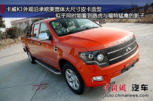 據卡威官方介紹,卡威的外觀沿承歐美皮卡設計風格,因此很容易能找到福特和路虎的影子。正如卡威總裁蔣丹平所言,要把歐美的皮卡文化帶到中國。