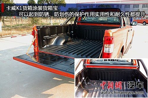 卡威K1第一眼看上去就會讓人想起福特F150,寬大的車身剛硬的線條,K1皮卡最大的特點就是國內首款越野車底盤皮卡,擁有突破性的1.5倍承載能力。另外,卡威K1還是中國首款寬體全尺寸大皮卡,1805mm的貨箱長度達到中國皮卡之最,比傳統皮卡貨箱多600L體積,能裝載更多貨物;另外,卡威K1軸距達3500mm,不僅讓外觀十分威猛,也讓客貨艙空間都有提升。