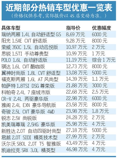 優惠方面,年前和年後的差別不大,東風日產軒逸和天籟都是1萬元左右的優惠。此前優惠極大的馬自達6,優惠大概少了2000元,馬自達5優惠減少更多。記者留意到,除個別品牌的優惠小幅收縮外,絕大多數品牌的優惠還是繼續延續年前的幅度。經銷商表示,雖然受到號牌限購影響,廣州市場每月成交量較為穩定,但傳統的2月~4月份仍然是淡季,清明之前整體購車氛圍也會比較平淡。經銷商預測今年上半年的車市增長平穩,隨著各品牌的新車陸續上市,銷量會逐步上揚。(文/表 記者鄧莉)