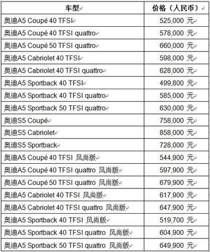 得益于新技術的加入,裝配奧迪A5 40 TFSI車型的2.0 TFSI發動機最大功率為165千瓦(225馬力),較前款發動機提升了10千瓦(13馬力),最大扭矩仍為350牛·米,但最大扭矩輸出區間擴大到1,500轉/分鐘- 4,500轉/分鐘。這使新款車型的最高時速提高到250公里/小時,0-100公里/小時加速時間降低了0.1秒,僅為6.4秒(奧迪A5 Coup岢40 TFSI quattro)。